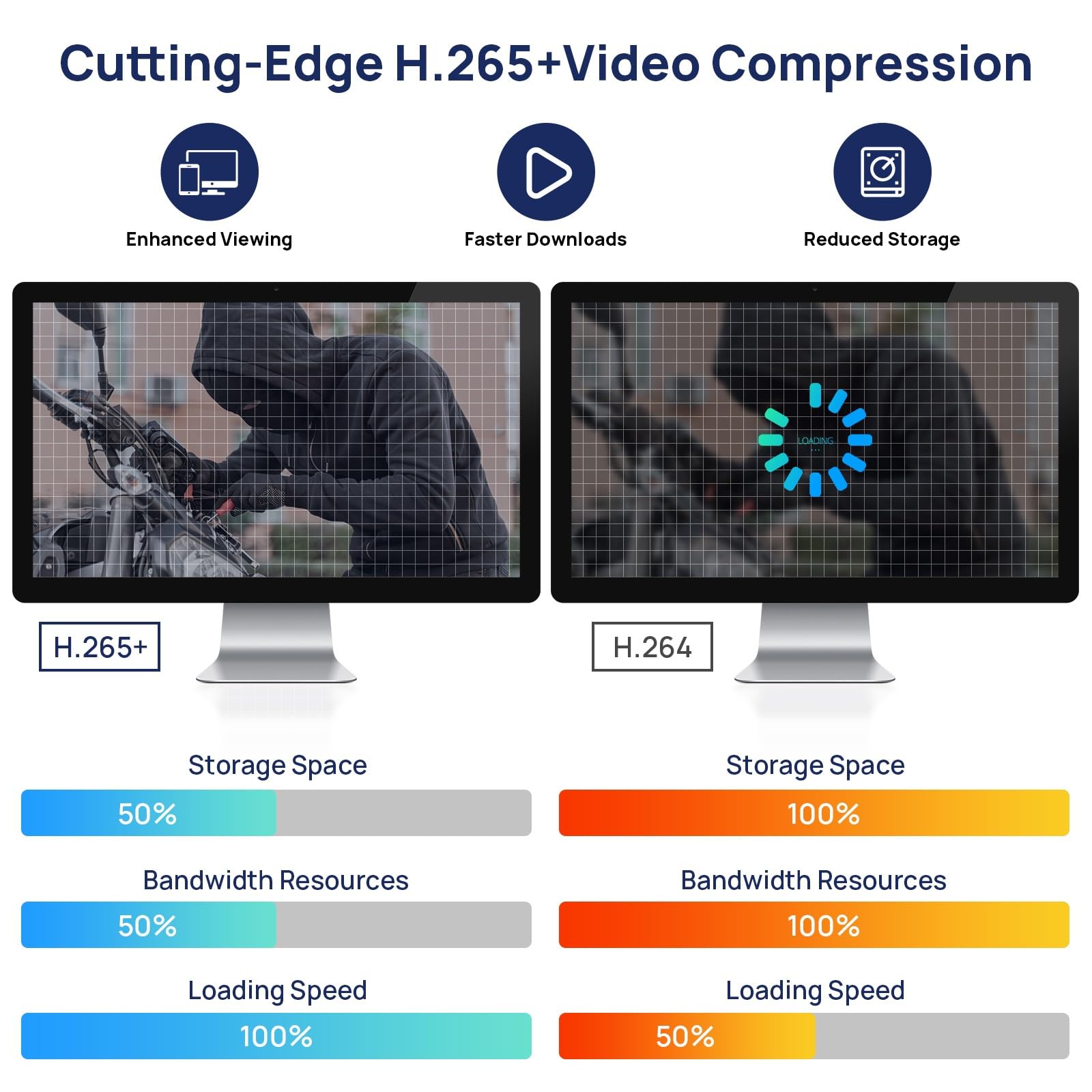 H.265+ technology offers enhanced viewing, faster downloads, and reduced storage compared to H.264. It saves 50% storage and bandwidth while doubling loading speed, optimizing efficiency.