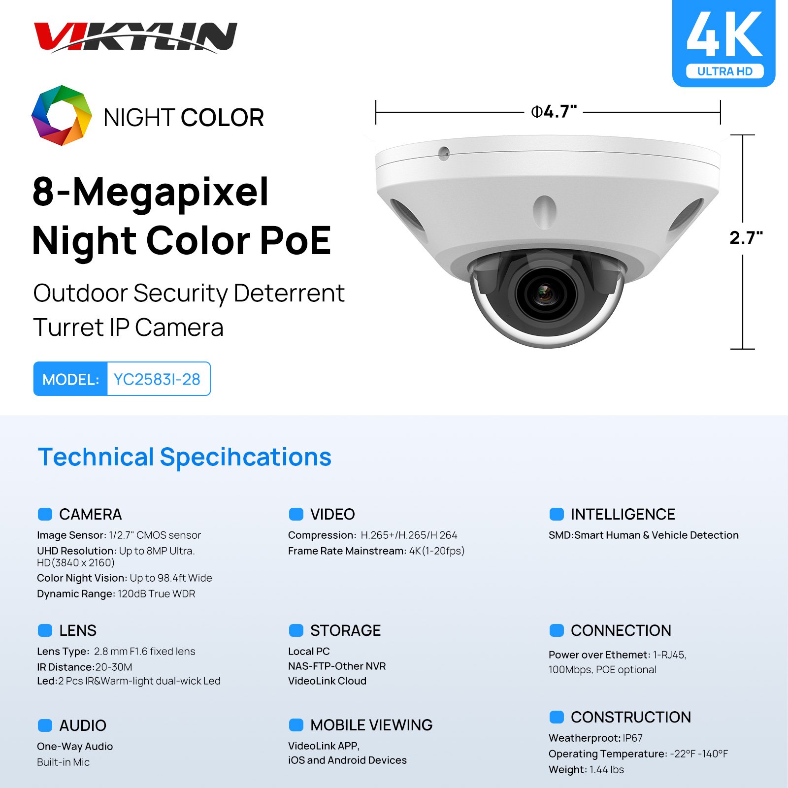 This 8MP full color camera outdoor can be used in extremely dark scenes, with excellent full-color technology and F1.6 aperture lens. Ultra HD 8MP (3840 × 2160)@20fps resolution have 1/2.8” 8 Megapixel Scan CMOS high-performance sensor and 2.8mm fixed lens provide an ultra-wide viewing angle of 112°, and its own soft supplemental lighting can ensure that the video is in night all have colorful details.