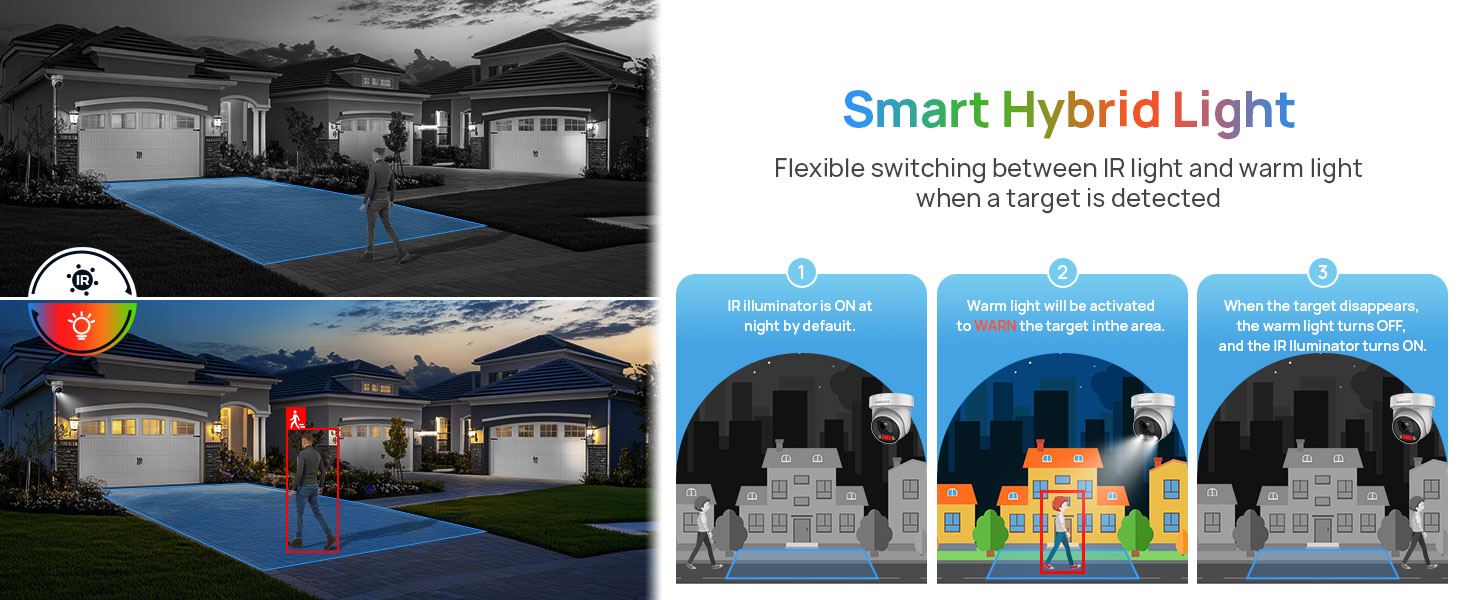 Equipped with a smart hybrid light, this camera allows flexible switching between IR light and warm light when a target is detected. The IR illuminator is on by default at night, and the warm light activates to warn targets in the area. When the target disappears, the warm light turns off, and the IR illuminator turns back on.