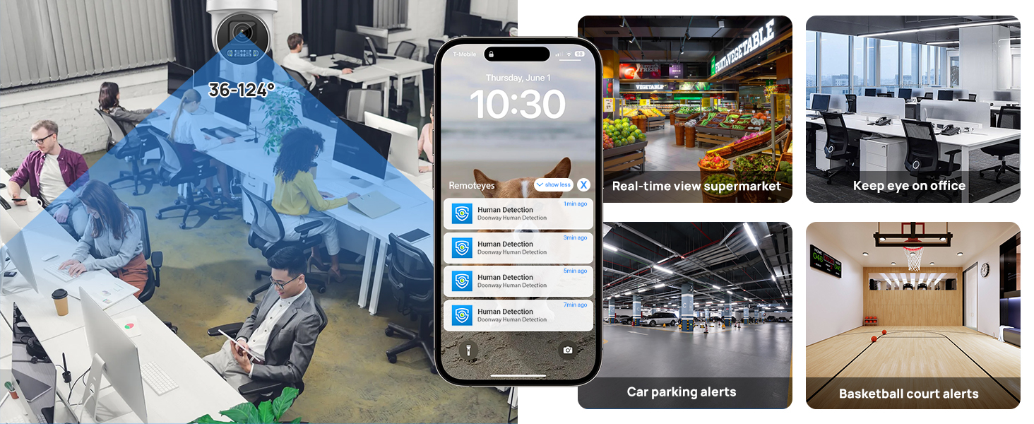 Users can keep an eye on their home, office, supermarket, or parking garage with real-time monitoring. The camera also provides car parking alerts and basketball court alerts.