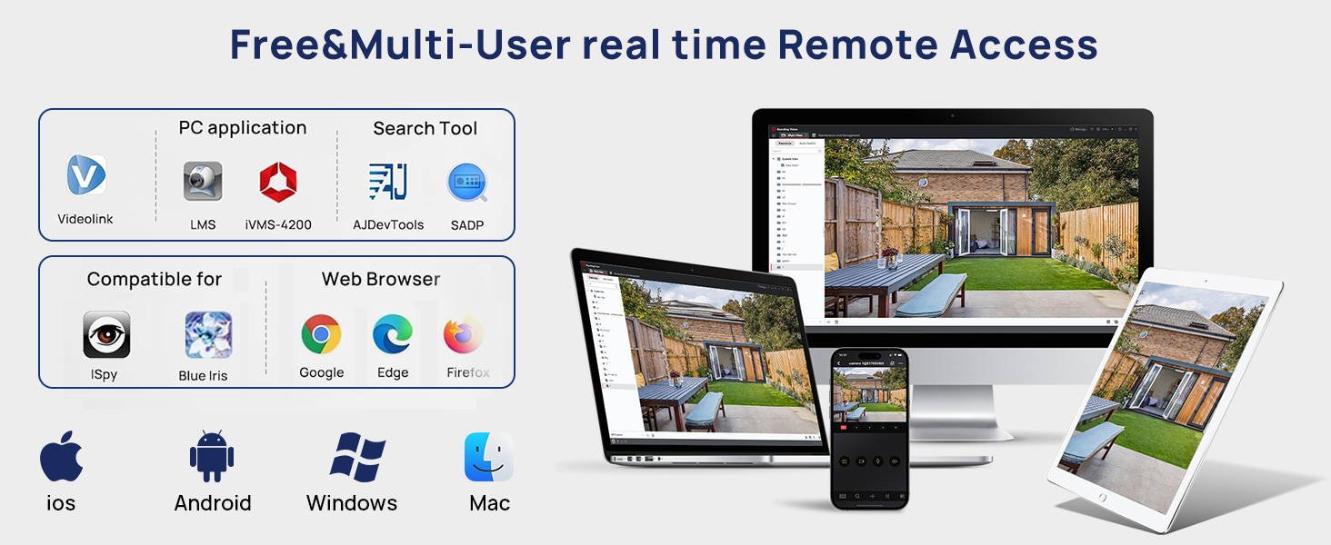Securely share live feeds with family, team members, or security personnel via the dedicated app—no subscription fees.
