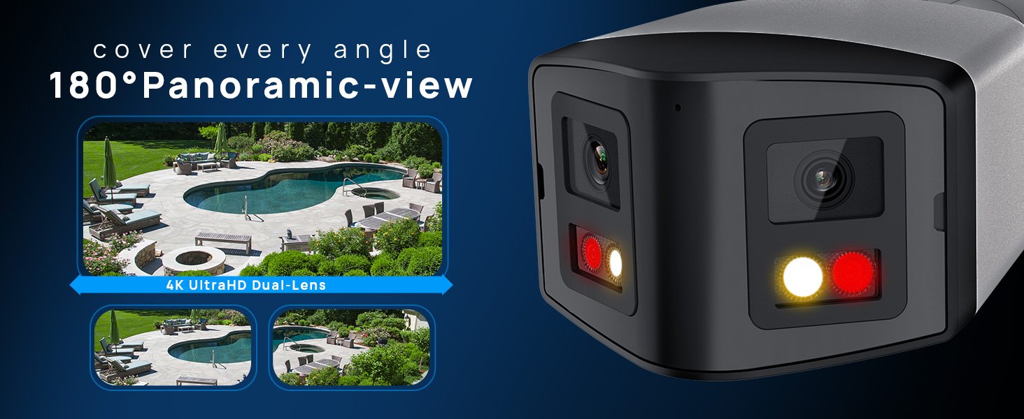 Dotata di tecnologia a doppio obiettivo 4K UltraHD, questa telecamera panoramica offre una vista panoramica a 180°, catturando ogni angolo della vostra proprietà con eccezionale chiarezza. Il sistema a doppia lente aumenta la copertura e garantisce una sorveglianza dettagliata.