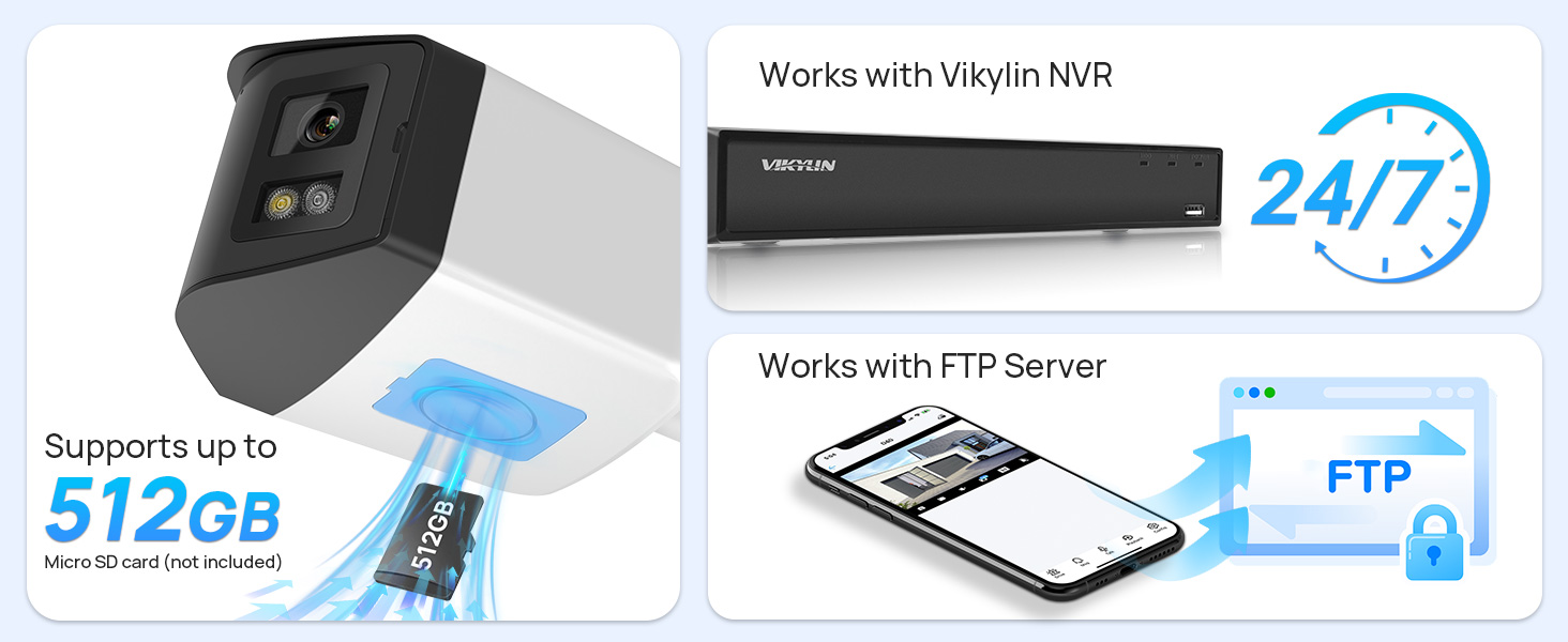 Supportando schede Micro SD fino a 512 GB (non incluse), la telecamera consente un'archiviazione locale estesa. Funziona inoltre perfettamente con i sistemi NVR e i server FTP per ulteriori soluzioni di archiviazione e backup.