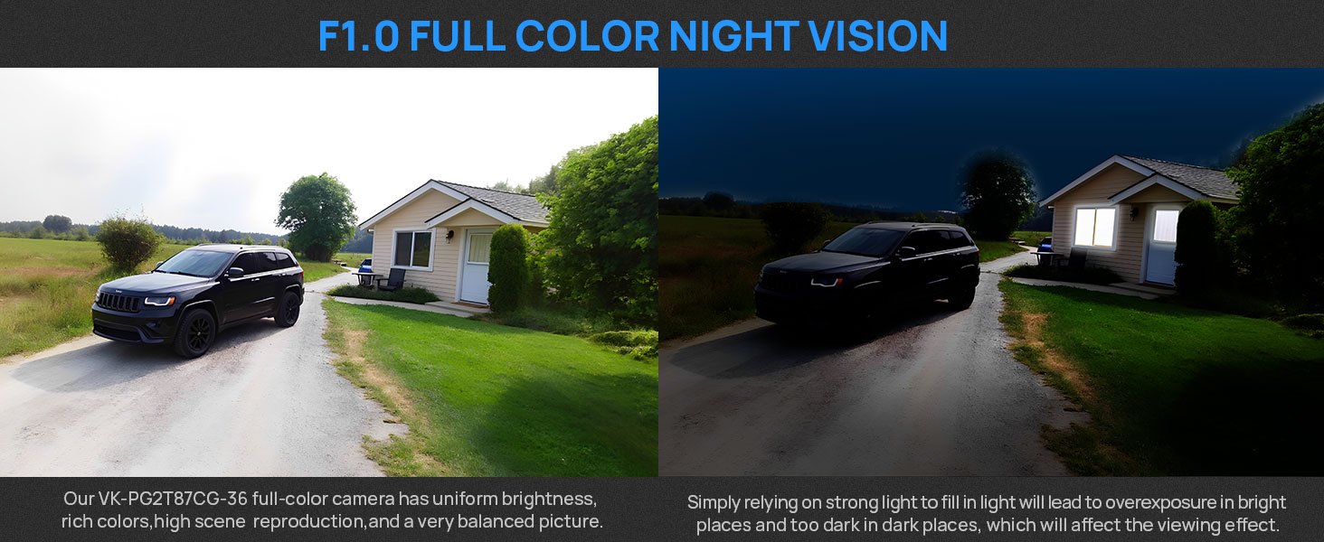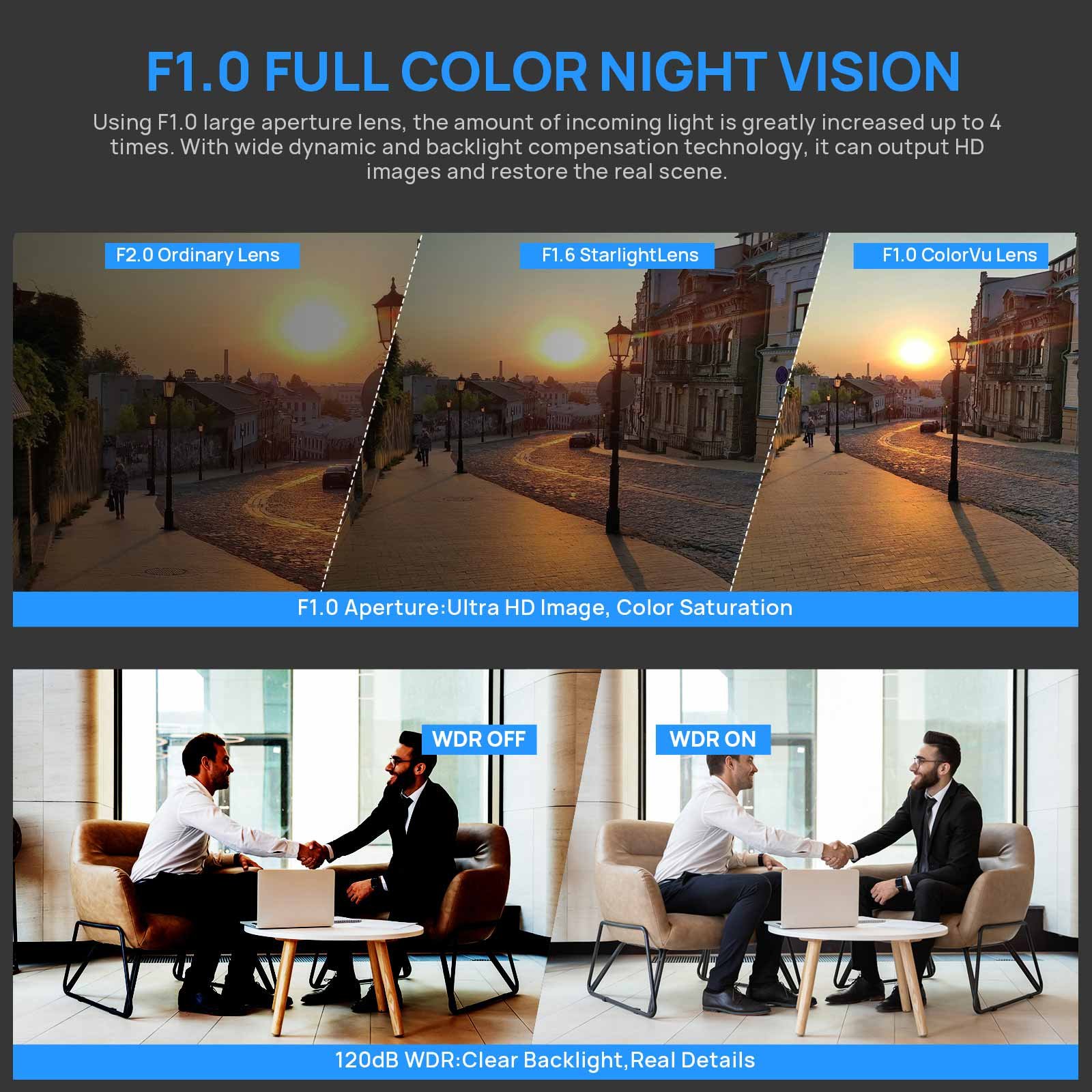 Experience superior clarity with the f1.0 large aperture lens technology. Unlike standard IR lenses, this full color night vision camera captures vivid, uniform brightness and rich colors even in pitch darkness, avoiding the overexposure issues common in traditional night mode.
