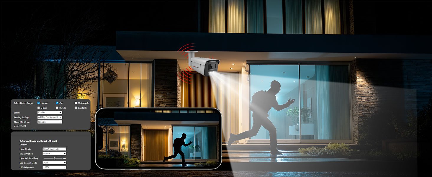 Enhance security accuracy with advanced algorithms. This smart detection camera specifically identifies humans and vehicles, filtering out false alarms. When a target is detected, the system triggers the spotlight, acting as a powerful active deterrence mechanism.