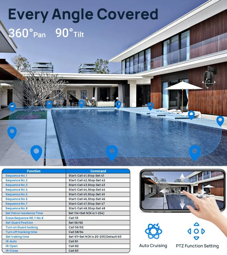 Auto-cruise function enables the camera to autonomously navigate through a predefined path, offering comprehensive surveillance coverage.