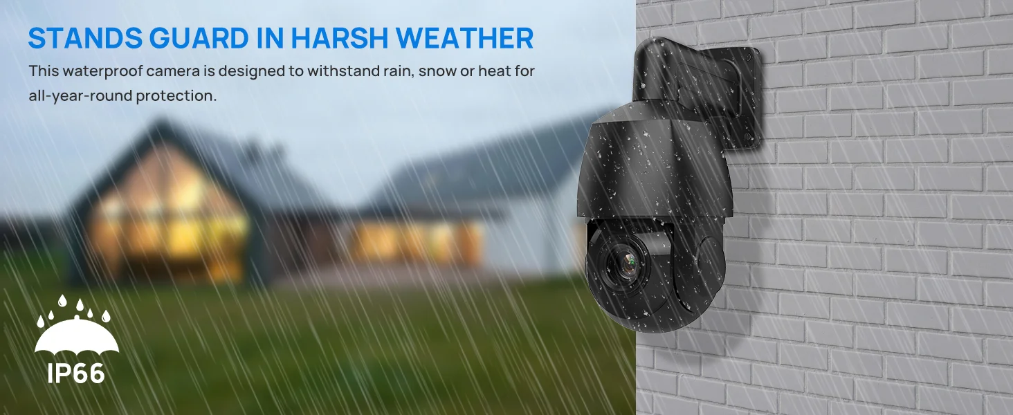 The camera is equipped with an IP66 waterproof rating, providing robust protection against challenging weather conditions.