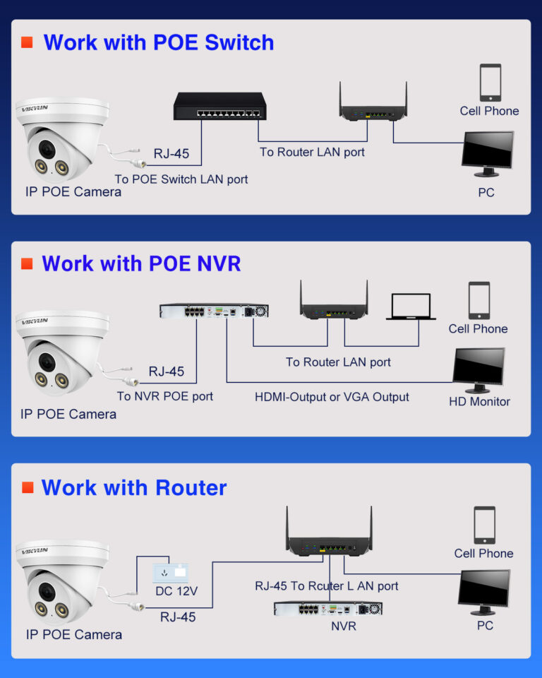 This night vision POE camera supports PoE NVR, PoE switch, or router connection via a single RJ45 cable. Power and data are transmitted simultaneously, ensuring stable performance and simplified installation.
