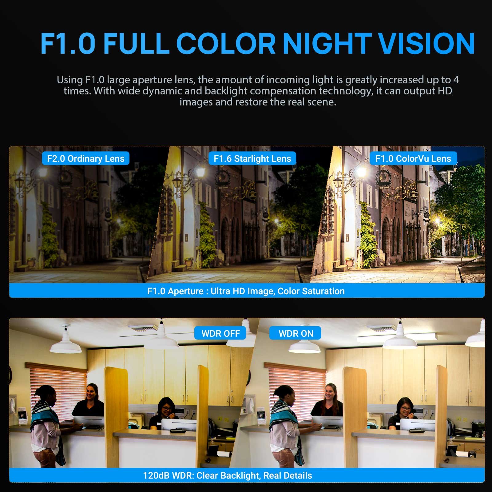 Equipped with an 8MP sensor and F1.0 large-aperture lens, this outdoor night vision CCTV captures more light at night. Dual white LEDs deliver true full-color images for 24/7 outdoor monitoring.