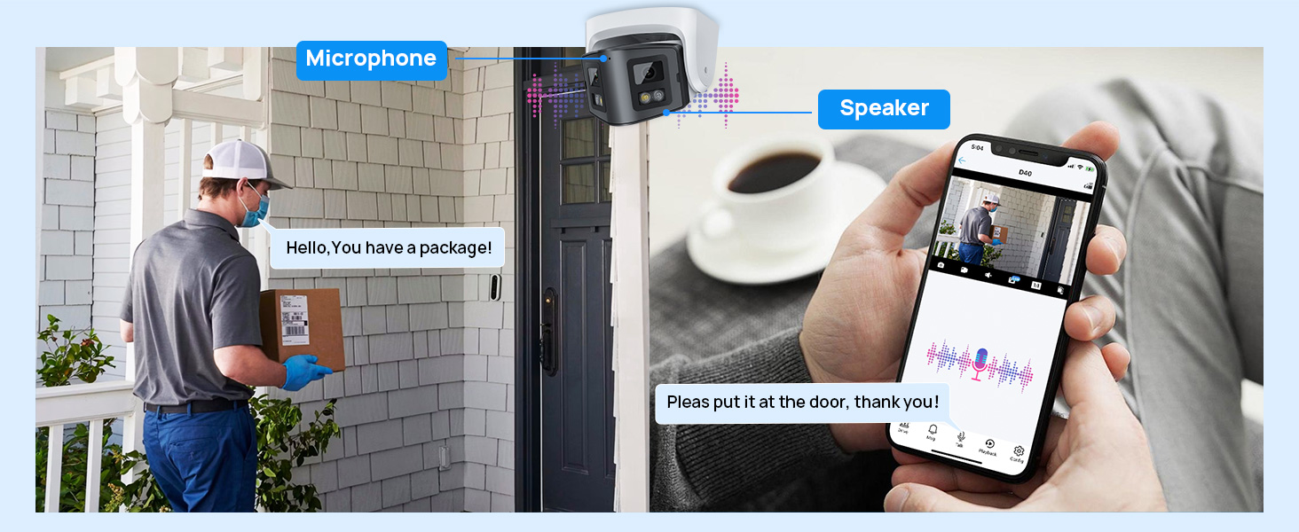 Built-in microphone and speaker enable real-time two-way audio communication. Communicate directly with visitors or deter intruders from anywhere by speaking through the camera, while clearly hearing what’s happening at your property.