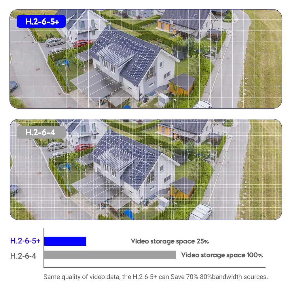 Supports H.265+, H.265, and H.264 video compression, saving bandwidth and storage space.