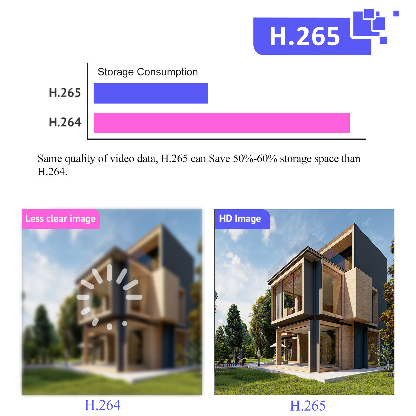 It also allows for faster, more fluid remote viewing, along with the ability to view more channels. At the seme bandwidth , video transmission is clearer and smoother, and more storage space and much money to buy hard disk will be saved.