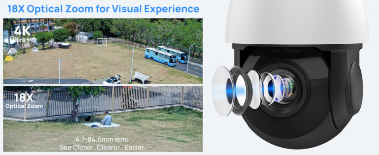 The 18x zoom camera PTZ features a 4.7–84.6mm motorized lens, allowing you to zoom in without image loss. Ideal for wide areas like parking lots, villas, and warehouses.