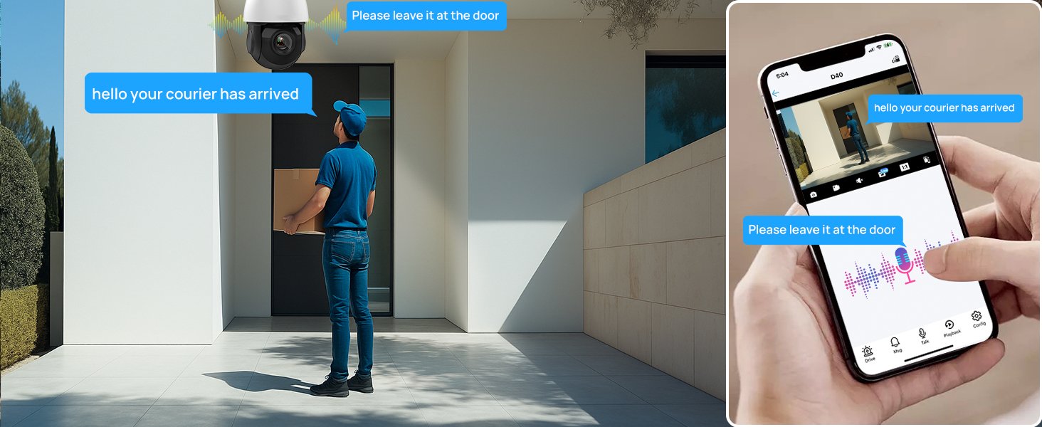 The built-in microphone and 3W speaker enable real-time communication. The PTZ camera with siren can issue audible warnings to deter intruders instantly.