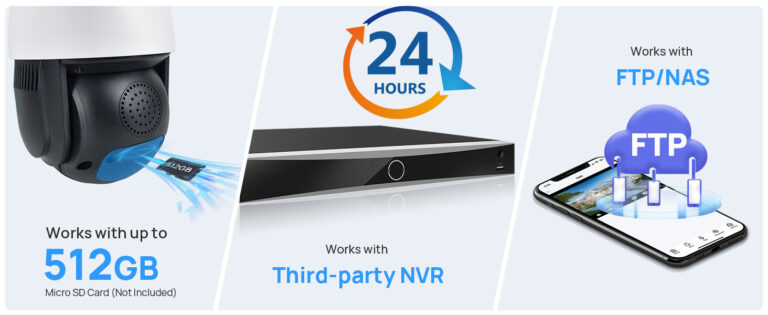 Supports microSD card up to 512GB, NAS (NFS/SMB), FTP, and third-party NVRs. Compatible with ONVIF, RTSP, and major VMS platforms for easy integration.