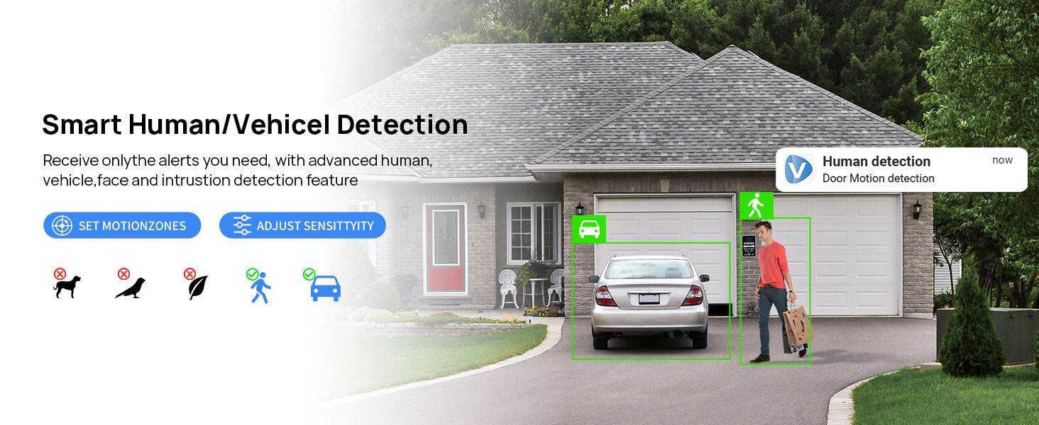 Utilizes advanced AI algorithms to distinguish between humans and vehicles, minimizing false alerts from animals or inanimate objects. Enhances security by prioritizing relevant threats.