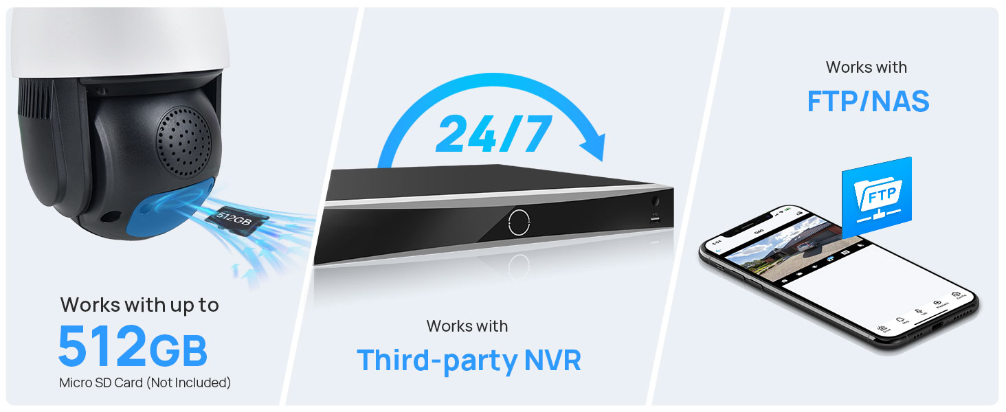 Stores up to 512GB of footage locally (SD card not included), ensuring continuous recording even during network outages. Easy to expand storage for long-term surveillance needs.