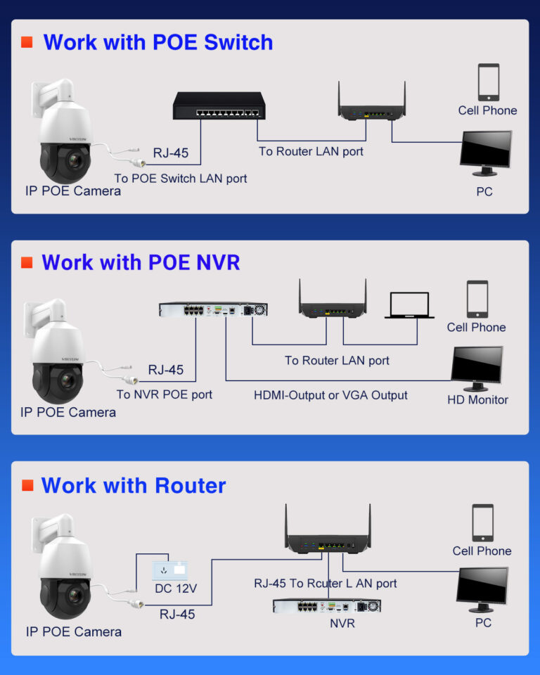 The AI PTZ camera supports PoE connectivity for simplified installation and stable data transmission. It integrates easily with NVR systems and network routers for flexible deployment.