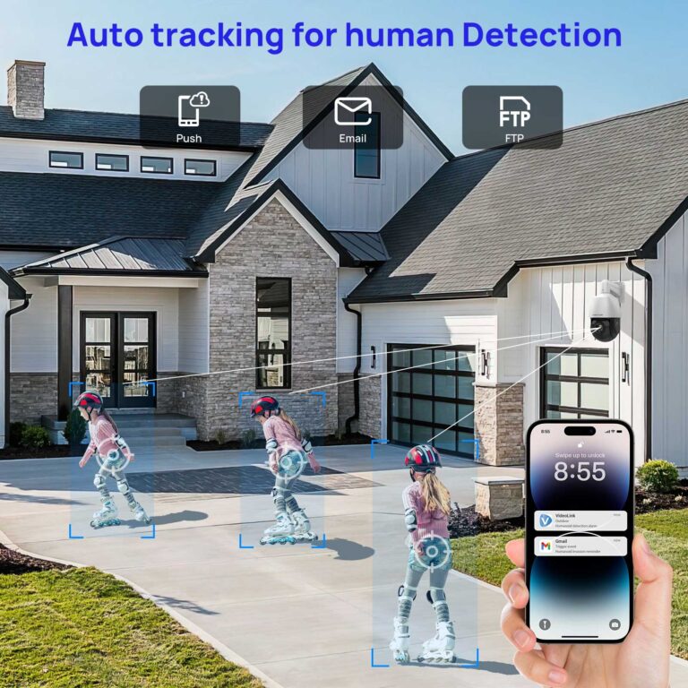 The AI PTZ security camera uses intelligent algorithms to identify humans and vehicles in real time. By filtering irrelevant motion, it improves alert accuracy and enhances overall security efficiency.
