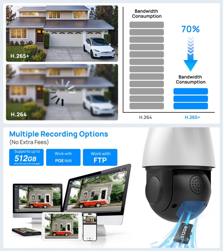 Equipped with a powerful 18x optical zoom camera, this PTZ system captures sharp details from far distances without image loss. Ideal for wide spaces such as parking lots, yards.