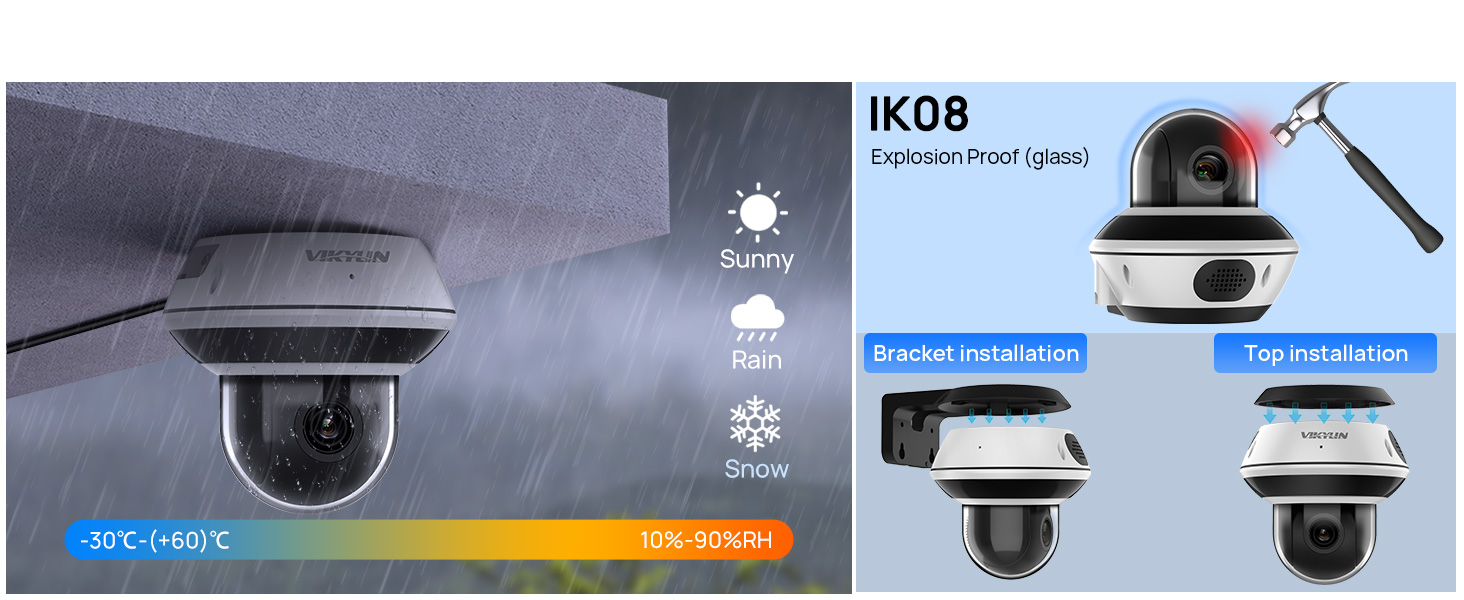 The camera supports both bracket and top installations, ensuring versatile mounting solutions for various environments. Its compact design blends seamlessly into residential and commercial settings.