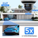 Thi PTZ dome camera features impressive 5X optical zoom with a 2.7-13.5 auto-focus lens, allowing for detailed viewing of distant objects. The PTZ function offers 350° pan and 87° tilt rotation, providing comprehensive coverage of large areas.
