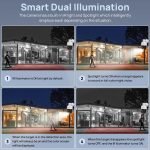 • Smart Dual Light Full Color Night Vision-Enhance low light image sensor and chipset that allows for up to 132ft full color night vision;Smart Dual Light technology adopts smart algorithm to detect targets. Usually, the IR illuminator is on at night when the target appears in the monitoring area, the white light is on, and the camera records the full-color video and information of key events. When the target is out of the monitoring area,the IR illuminator is on, which reduces light pollution efficiently