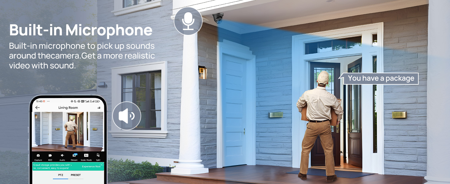 This camera includes a built-in microphone that captures sounds around it. This feature allows for more realistic video with sound, providing an enhanced monitoring experience and enabling you to hear what’s happening in addition to seeing it.