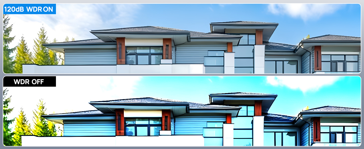 The camera features a 120dB WDR (Wide Dynamic Range) function that significantly enhances image quality. With WDR ON, the camera captures balanced and clear images even in challenging lighting conditions where there are both bright and dark areas. This ensures superior visibility and monitoring accuracy.