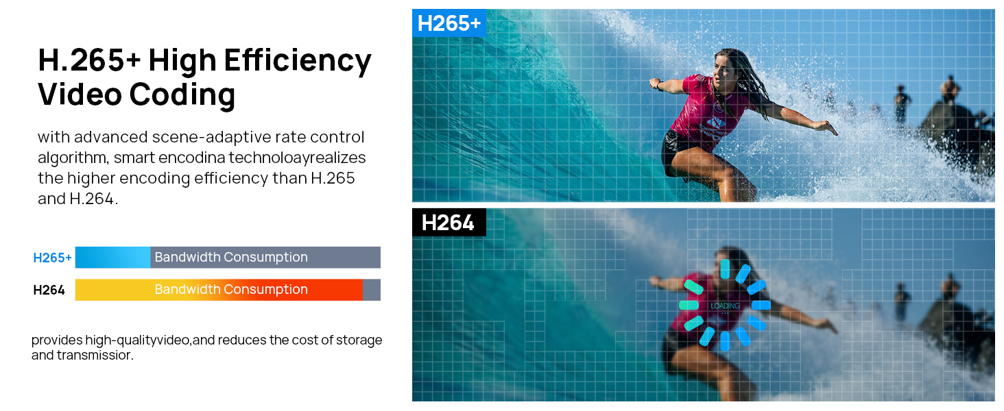 Equipped with advanced scene-adaptive rate control algorithms, this camera utilizes H.265+ technology to achieve higher encoding efficiency than H.265 and H.264. It provides high-quality video while reducing bandwidth consumption and lowering storage and transmission costs.
