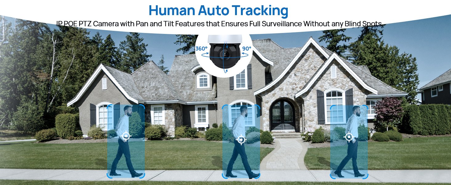 With IP POE PTZ and human auto tracking features, this camera ensures full surveillance coverage without any blind spots, automatically focusing on human movement.