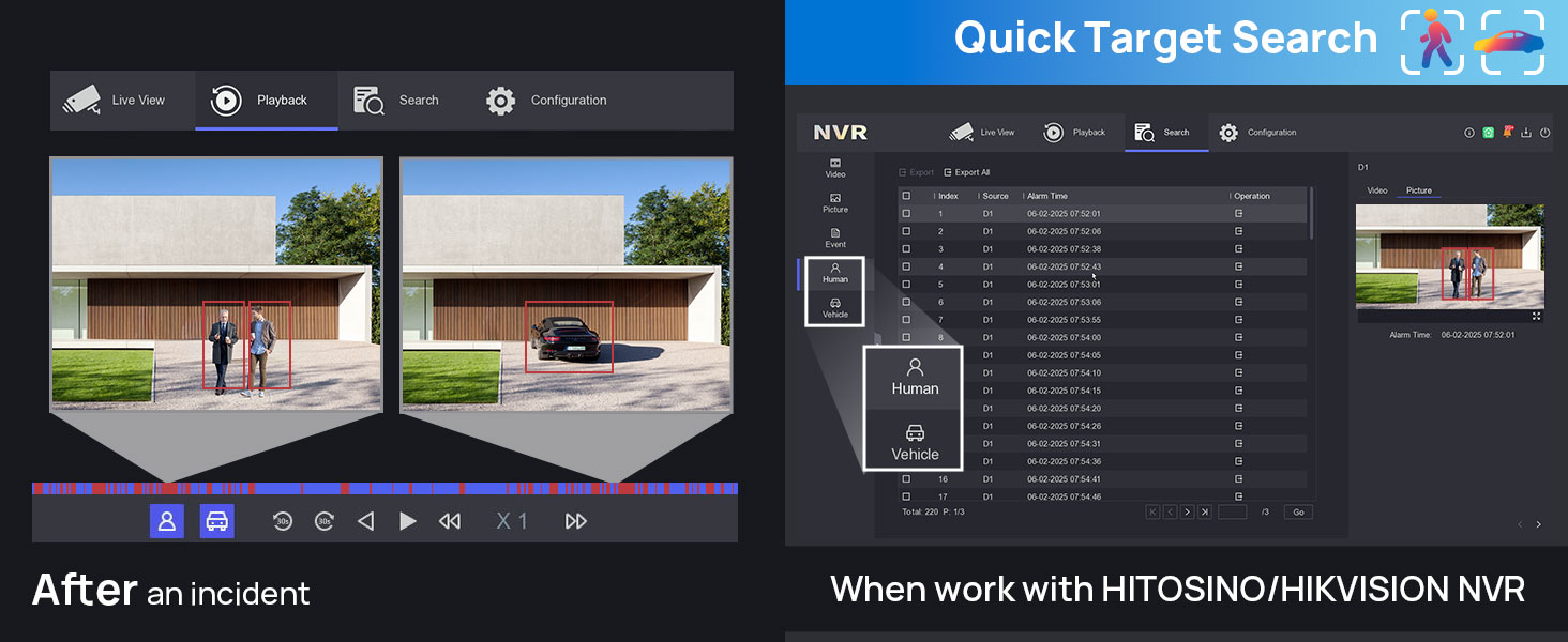 When used with HITOSINO/HIKVISION NVR, the camera supports quick target search for humans and vehicles. After an incident, users can easily search for and review relevant footage.