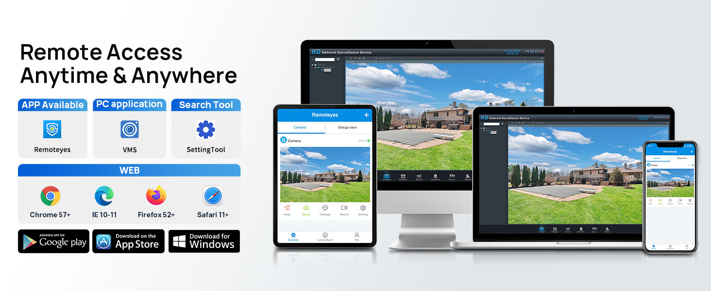 Users can access the camera remotely anytime and anywhere through various platforms including a dedicated app, PC application, web browsers (Chrome 57+, IE 10-11, Firefox 52+, Safari 11+), and search tools.