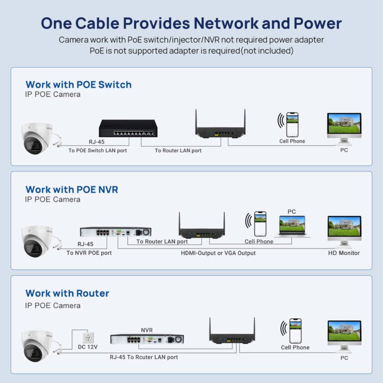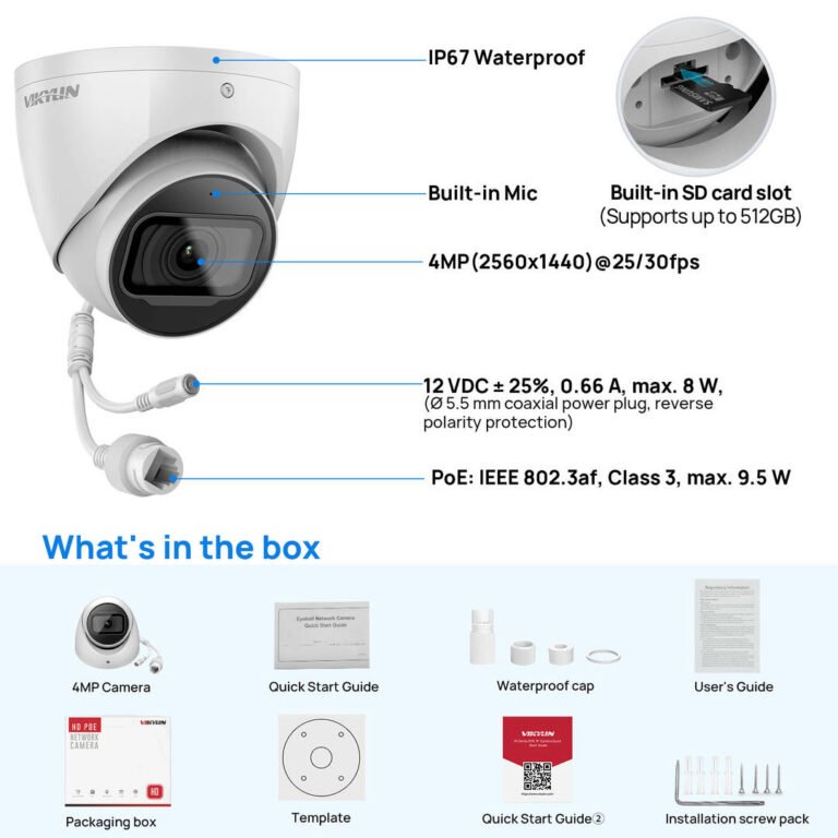 Designed for versatile integration, this starlight 4MP IP camera is fully compatible with PoE switches, allowing for simplified power and data transmission through a single cable. It also works seamlessly with VIKYLIN NVR systems, facilitating centralized video recording and management. Moreover, it can easily connect with standard routers, ensuring smooth network integration in various setups.