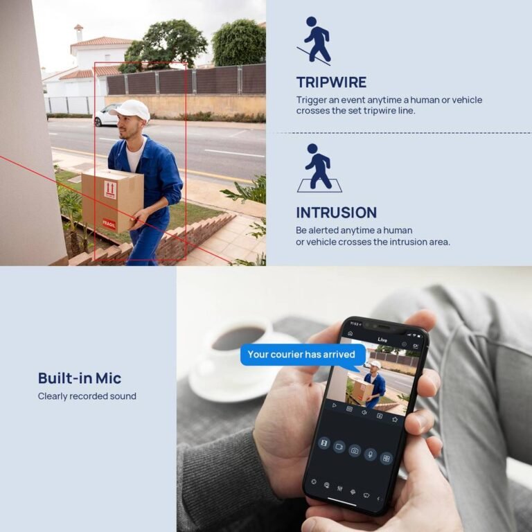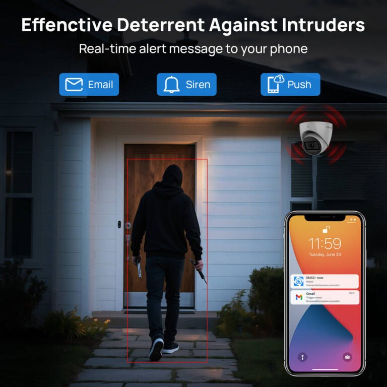 The camera provides effective perimeter protection, keeping a vigilant eye on designated boundaries and triggering alerts when any unauthorized activity is detected within the perimeter. Furthermore, it features a built-in microphone, allowing for audio recording alongside video, providing comprehensive surveillance with both visual and audio evidence.