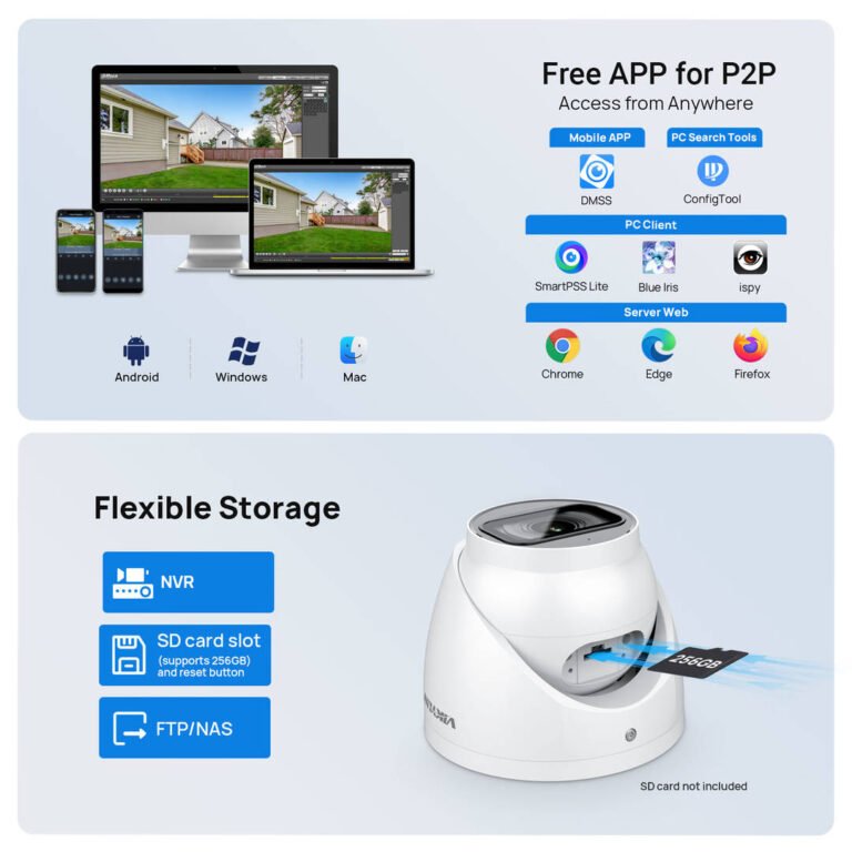 This AI detection IP camera offers flexible storage options to meet diverse needs, ensuring you can easily manage and access recorded footage. Additionally, it comes with a free P2P app, enabling convenient remote viewing and control of the camera from anywhere via your mobile device, providing seamless connectivity and ease of use.