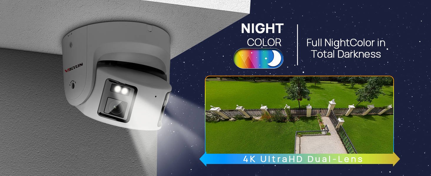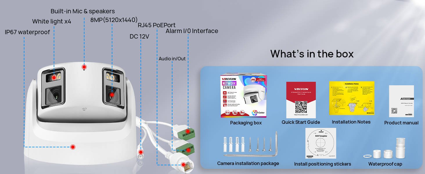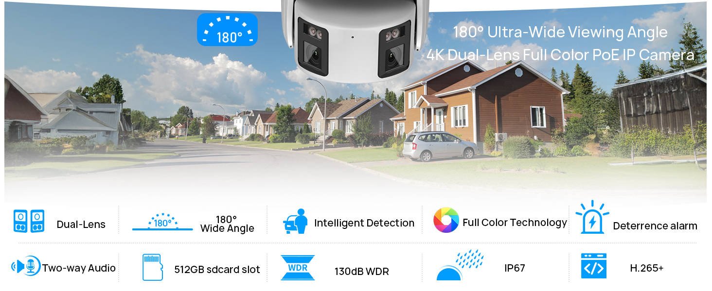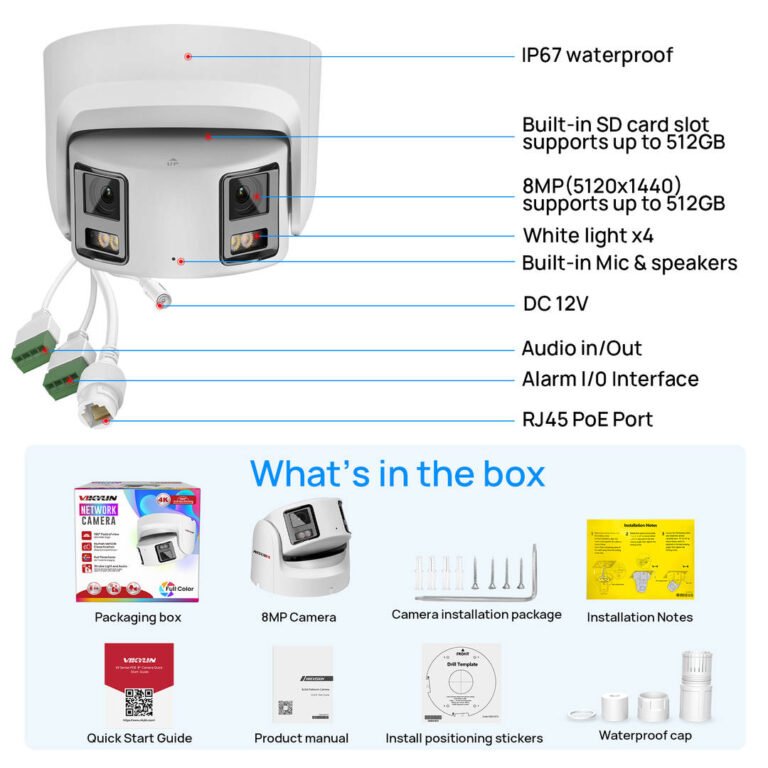 Благодаря двойным линзам, эта POE IP-камера может получить 180 широкий обзор, вы можете увидеть больше сцен вокруг вашего дома. Также камера имеет разрешение 3840×2160 ,8MP high HD, вы можете видеть более четкие детали.