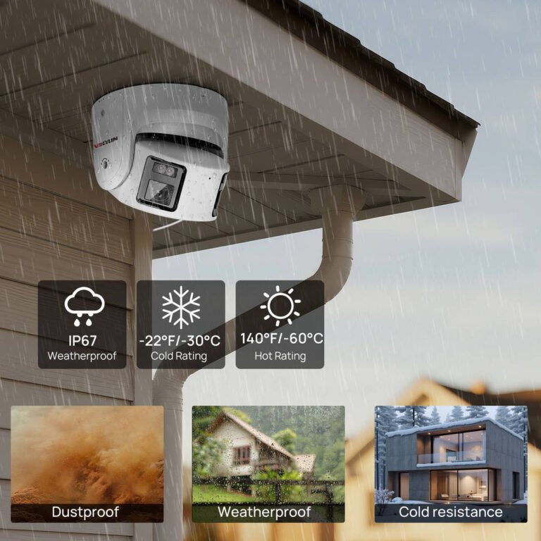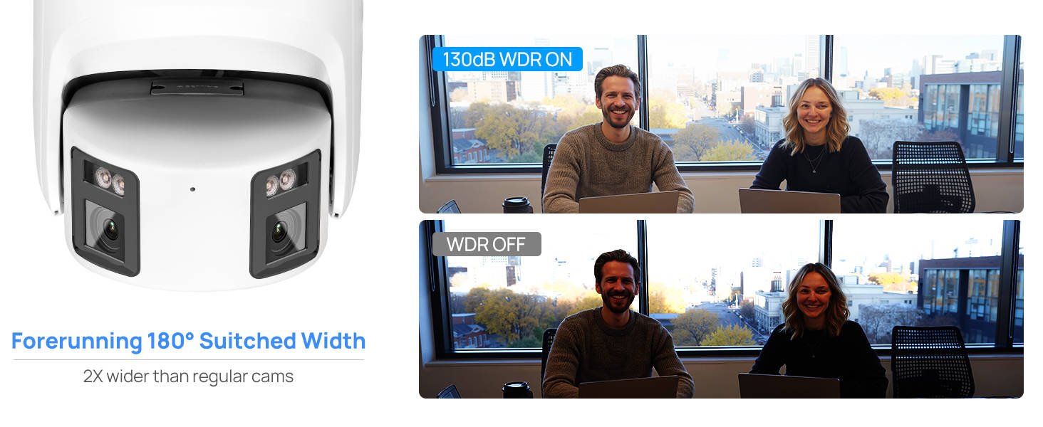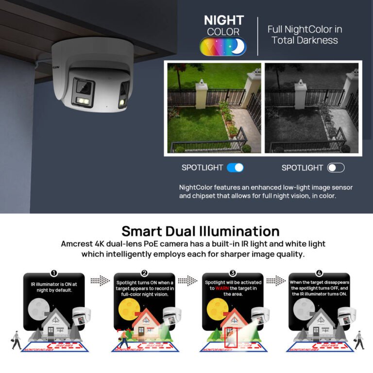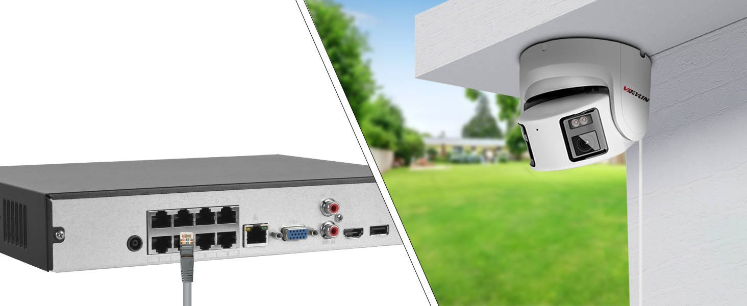 Благодаря двойным линзам, эта POE IP-камера может получить 180 широкий обзор, вы можете увидеть больше сцен вокруг вашего дома. Также камера имеет разрешение 3840×2160 ,8MP high HD, вы можете видеть более четкие детали.
