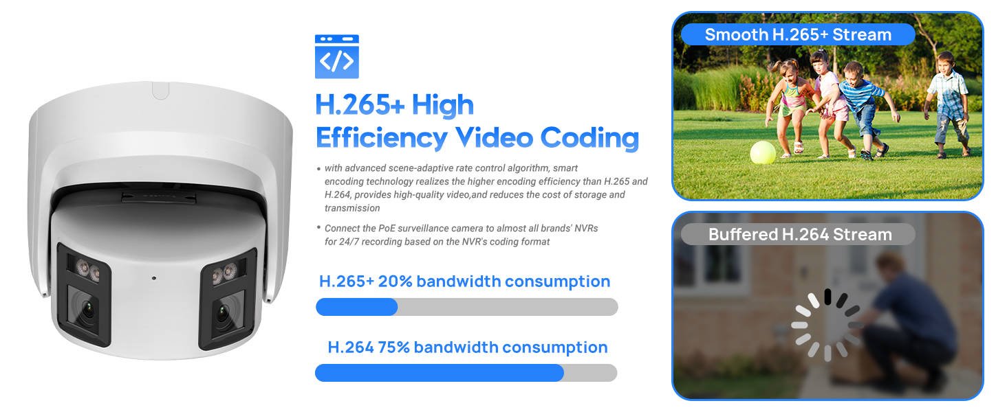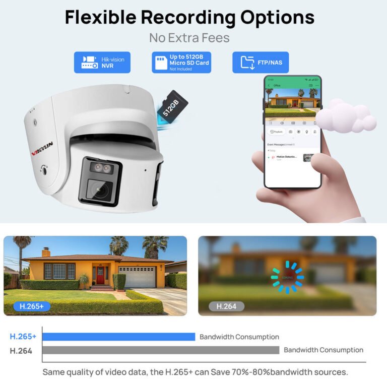 The camera utilizes H.265+ video compression technology, which reduces file sizes while maintaining high video quality. This efficient compression saves storage space and bandwidth, enabling smoother video transmission and longer recording times.