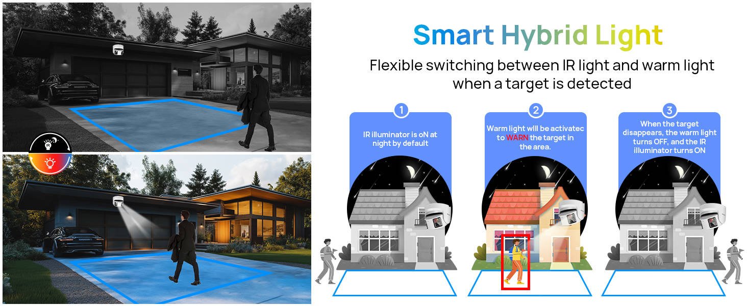 Equipped with an intelligent dual light source, the camera switches between infrared and white light based on the lighting conditions. In low light, it uses infrared for clear black-and-white images, while in darker environments, it activates white light to provide full-color visuals, ensuring optimal image quality.