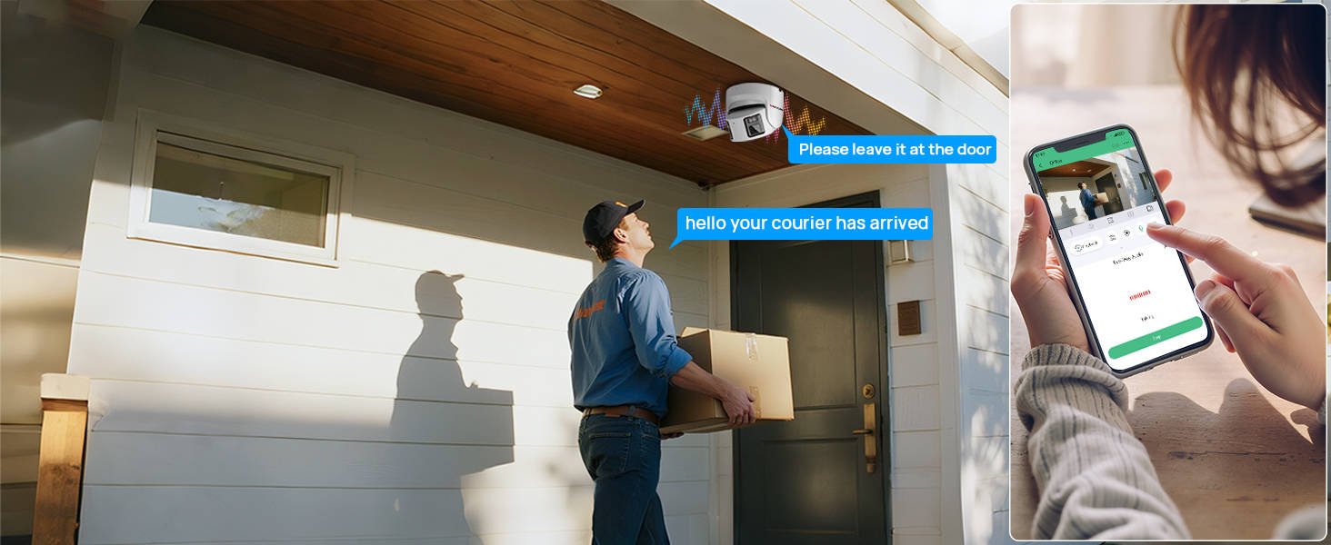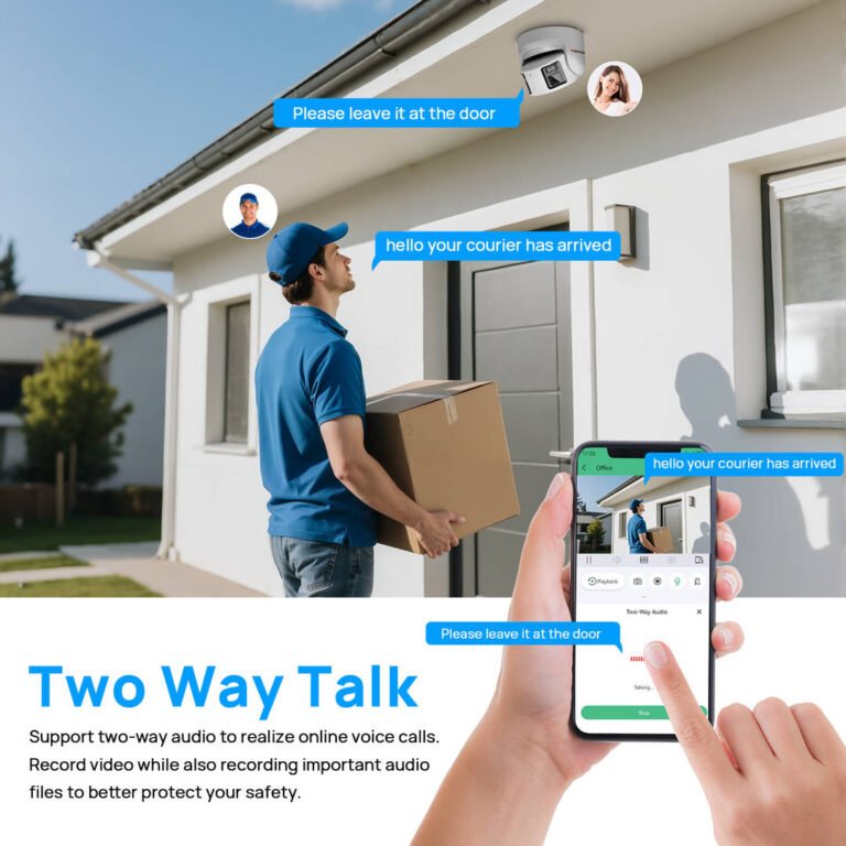 Featuring two-way communication, the camera allows users to talk and listen remotely. This enables real-time interaction, such as communicating with visitors at the door or giving instructions to people in the monitored area.