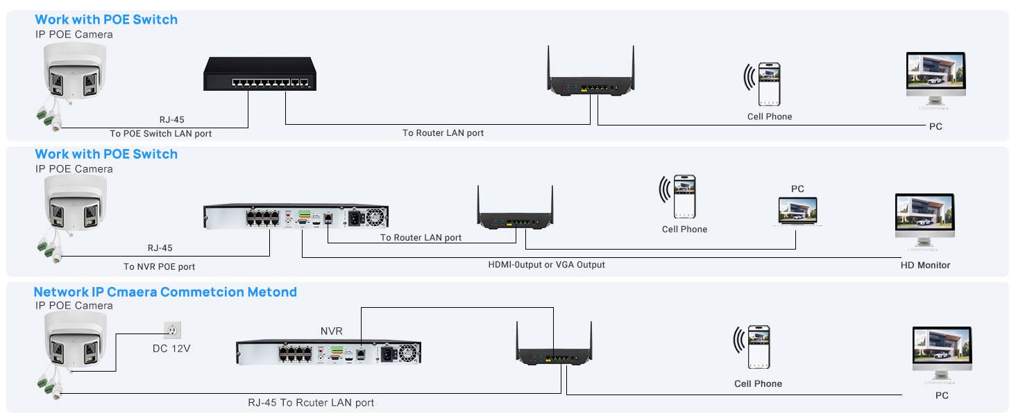 This surveillance camera offers versatile connectivity options, supporting connection via POE switch for simplified power and data transmission, NVR for centralized video recording and management, and Router for straightforward network integration, ensuring flexible setup in various environments.